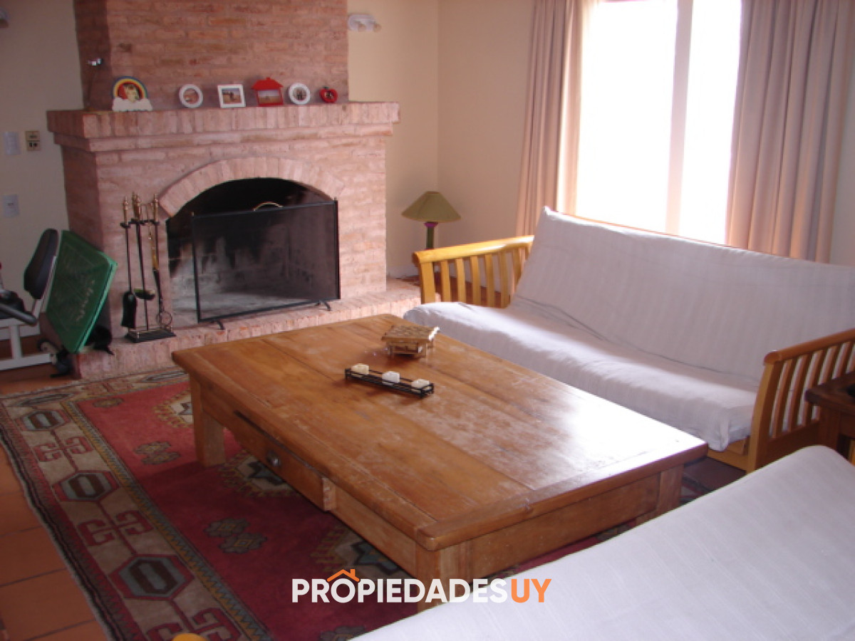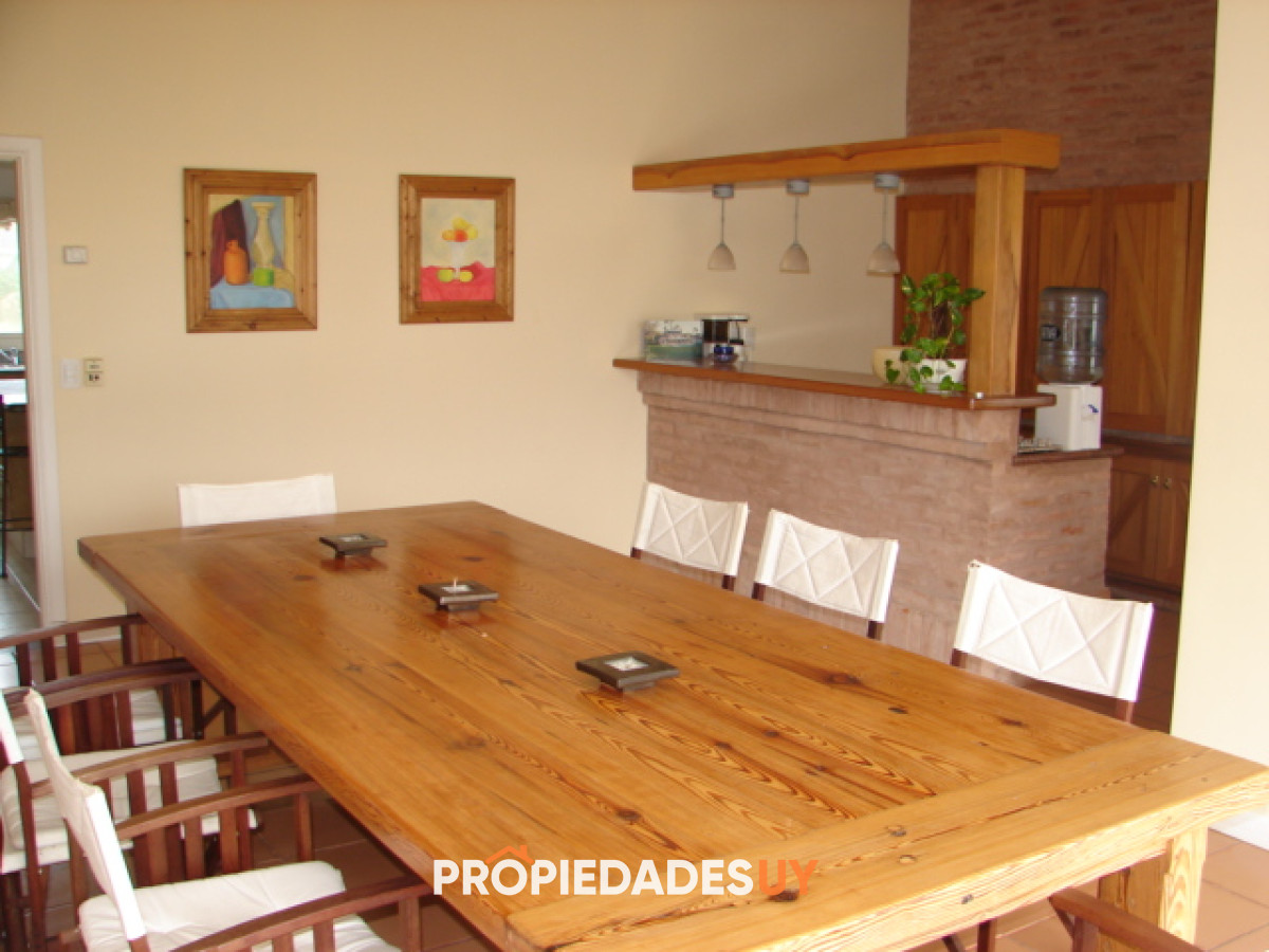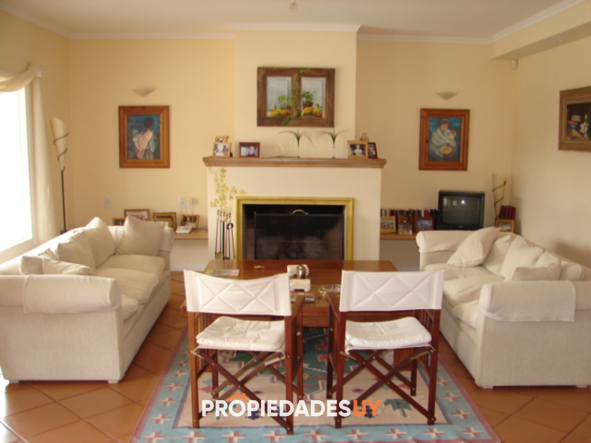 Amplio living con estufa a leña, estar, comedor, cinco dormitorios, tres en suite, barbacoa, piscina y garaje.