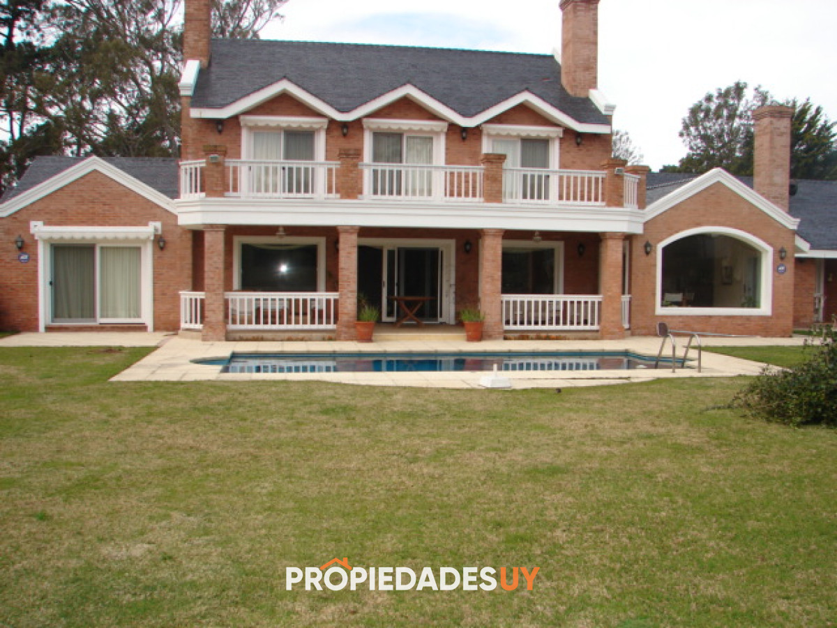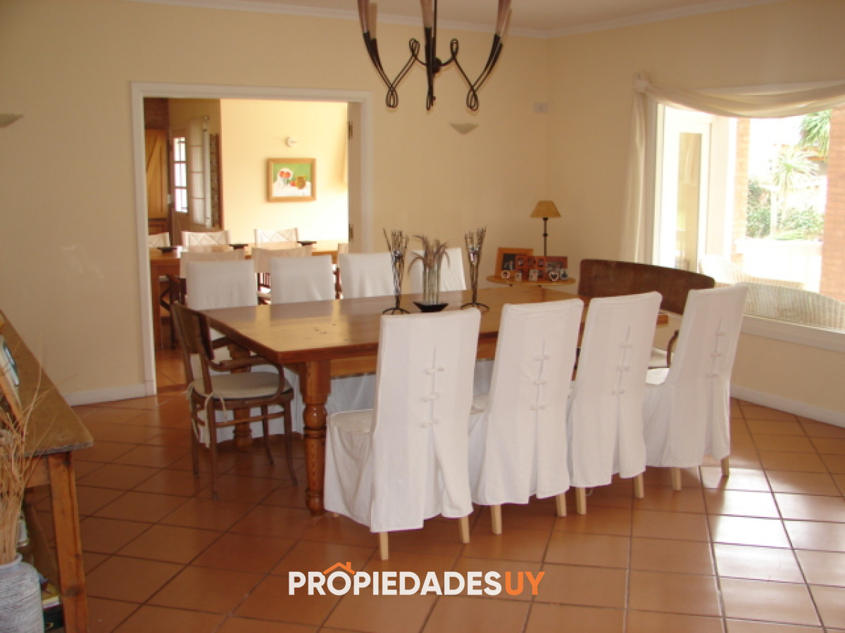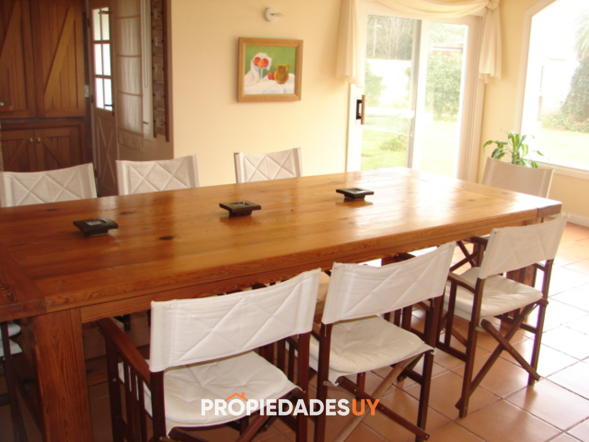Amplio living con estufa a leña, estar, comedor, cinco dormitorios, tres en suite, barbacoa, piscina y garaje.